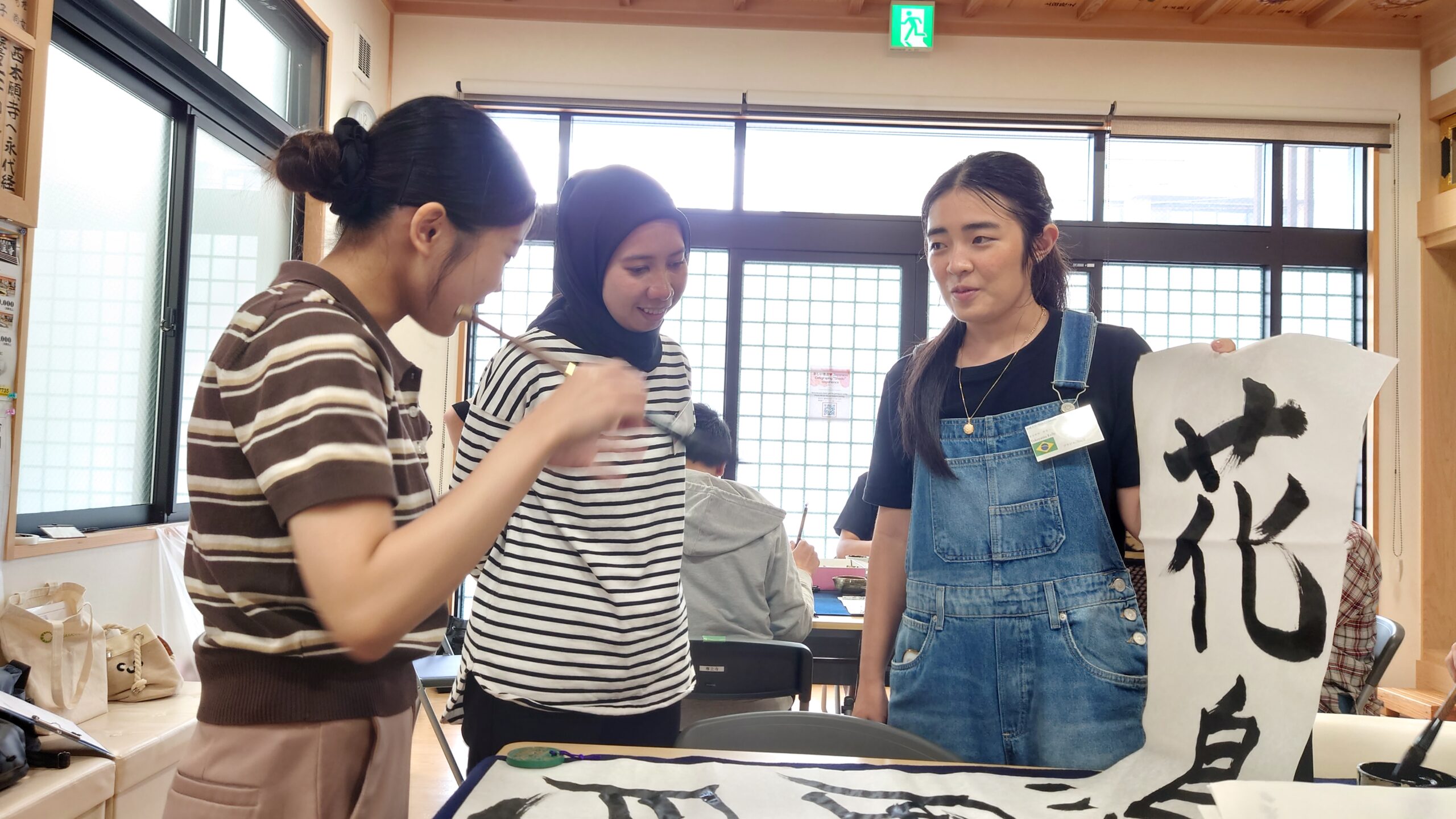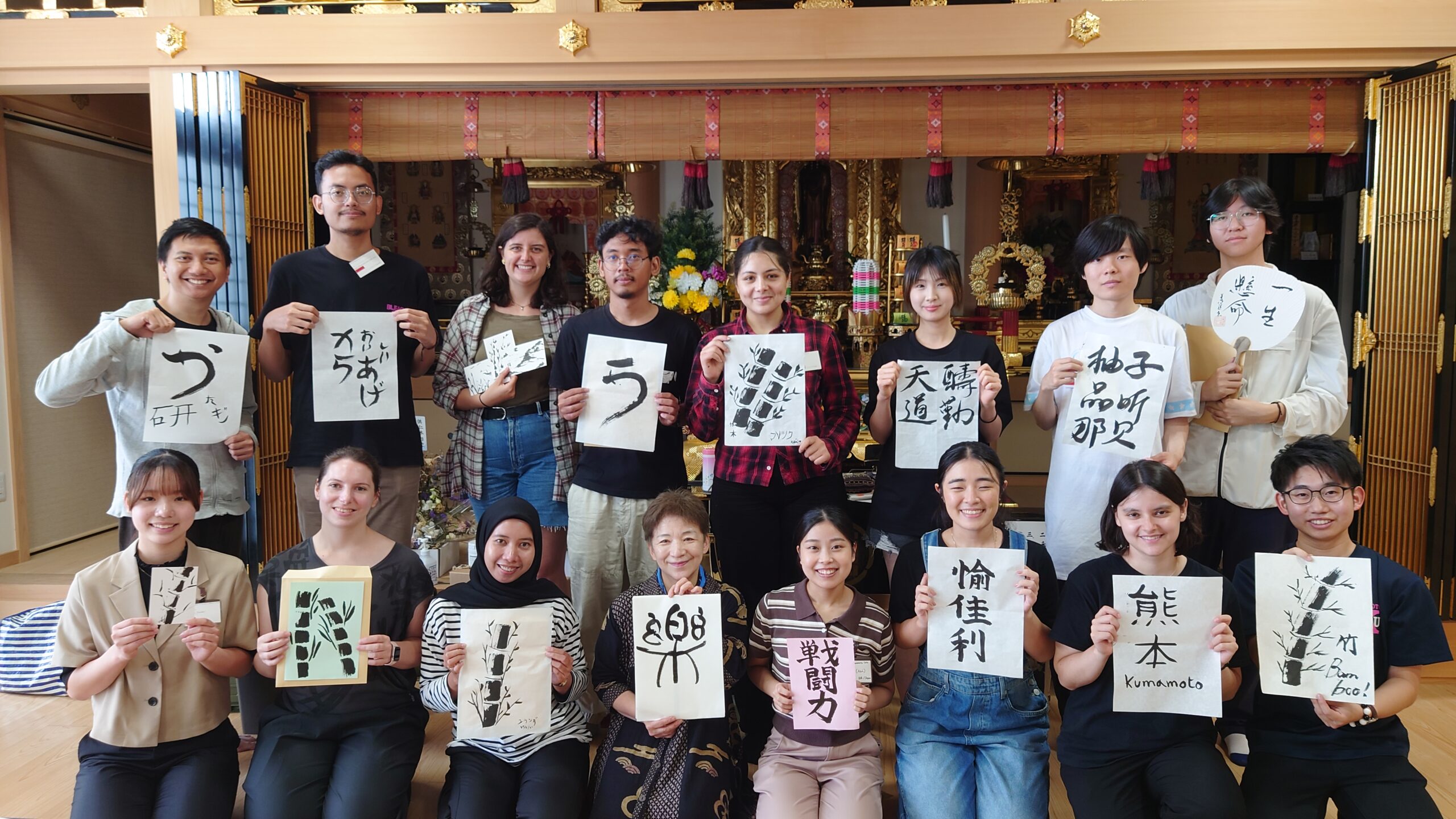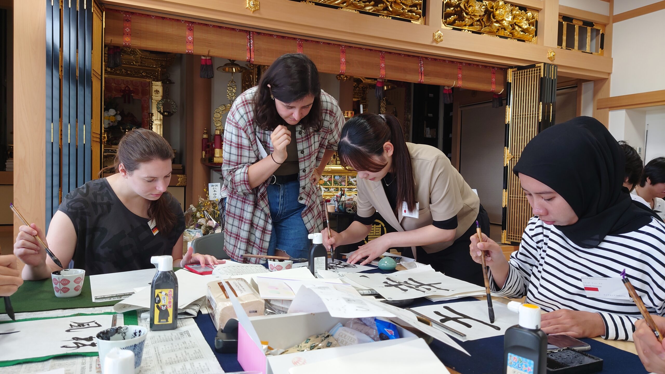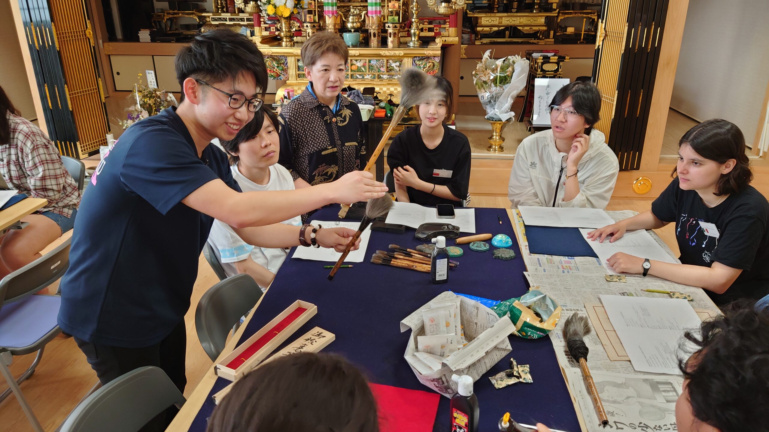 日本の伝統文化である書道について学ぶため、専立寺にて書道体験ワークショップを行いました。