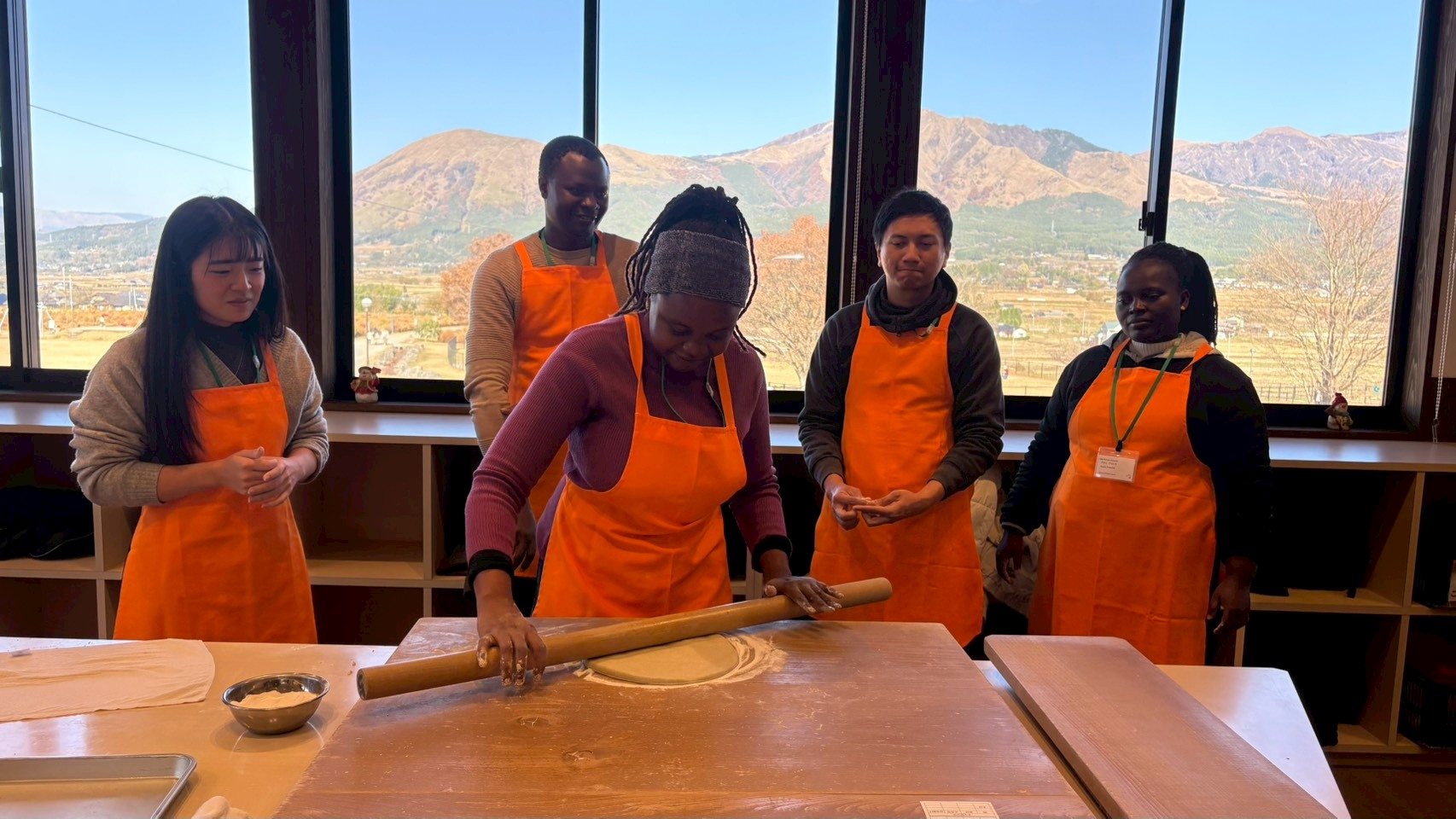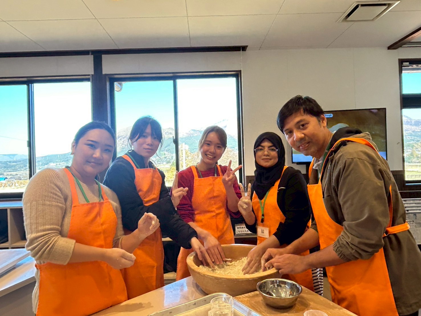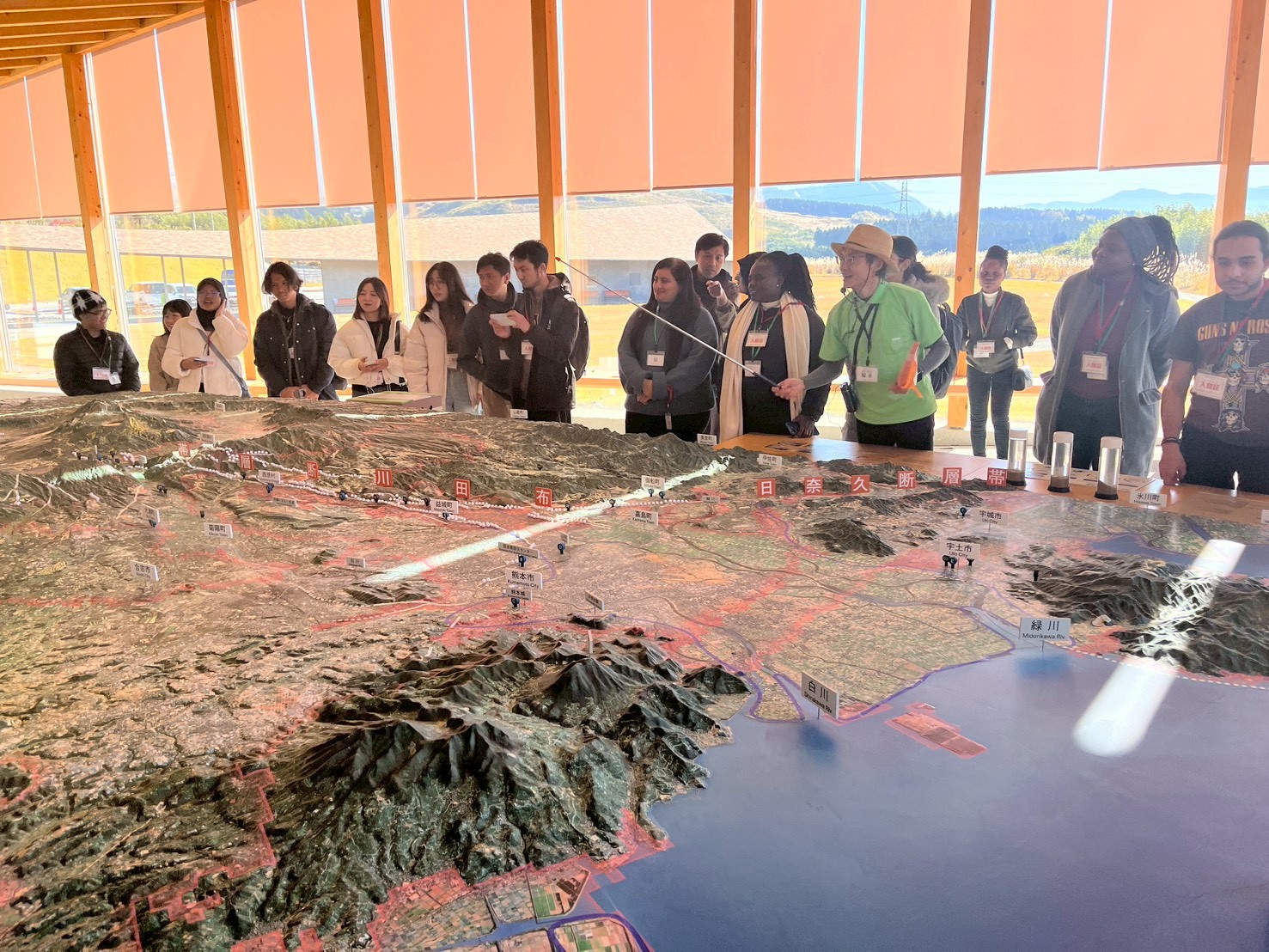 阿蘇の自然と熊本地震について学ぶため、南阿蘇へ日帰りバスツアーを行いました。熊本地震震災ミュージアムKIOKUでは、当日の揺れの様子、避難から復興までの道のりについて学び、実際に地滑りでつぶれた看板や、壊れた車の展示、ひび割れた土地なども見学しました。久木野ではそば打ちも体験し、上色見熊野座神社も見学しました。地震について学ぶだけでなく、大学や国籍を超えて交流ができ、大変有意義な時間となりました。