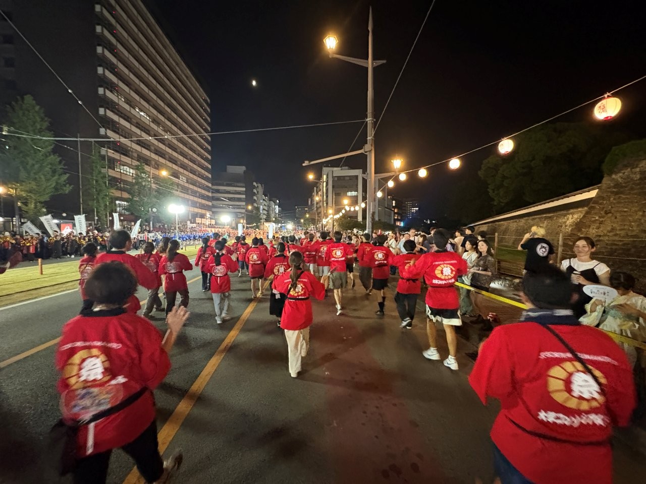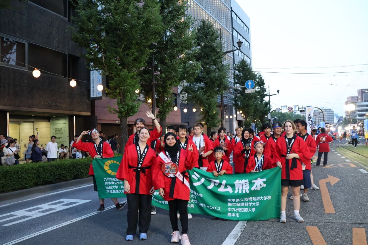 参加した学生たちは、練習の成果を発揮して元気よく踊り、熊本の夏祭りに参加できたことをとても喜んでいました。ドイツ、パキスタンの留学生が連代表として列の先頭を努め、たいへんな暑さでしたが、みんなで一体となって盛り上がり、熊本の思い出として楽しむことができました。祭りへの参加を通して熊本の文化を学び、学生同士の絆を深めることができました。
